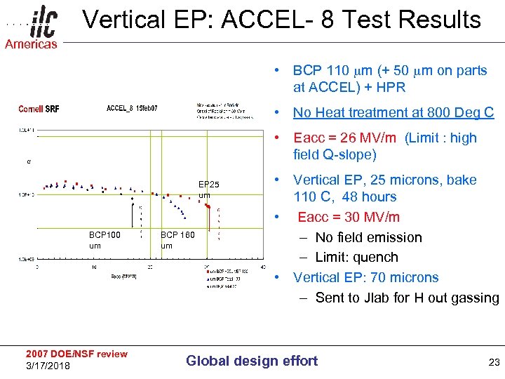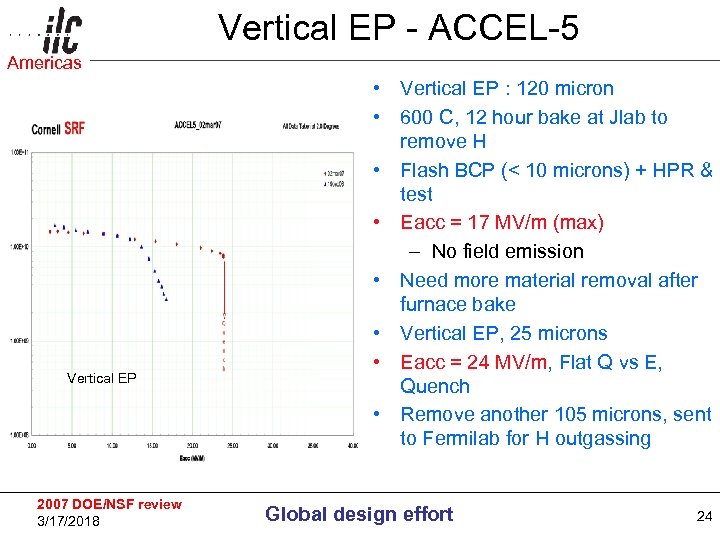 Vertical EP: ACCEL- 8 Test Results Americas • BCP 110 m (+ 50 m on parts at ACCEL) + HPR • No Heat treatment at 800 Deg C • Eacc = 26 MV/m (Limit : high field Q-slope) EP 25 um BCP 100 um 2007 DOE/NSF review 3/17/2018 BCP 160 um • Vertical EP, 25 microns, bake 110 C, 48 hours • Eacc = 30 MV/m – No field emission – Limit: quench • Vertical EP: 70 microns – Sent to Jlab for H out gassing Global design effort 23