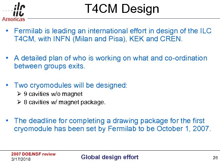 Cryomodule Fabrication Americas • Fermilab plans to assemble 1 st cryomodule using a kit from DESY in CY 07. – 2 cavities of this kit is here at Fermilab – Another 2 are ready for shipment, Rest is awaiting horizontal test at DESY – The cold mass is getting ready to be shipped. • Fermilab plans to assemble 2 nd cryomodule using – – – Cavity purchased and processed in US ( 10 cavities ) The cold mass has been ordered through INFN from Zenon The tuner and associated parts have been ordered through INFN Couplers have been bought from CPI and will be processed at SLAC We plan to assemble this cryomodule in mid FY 08. • Cryomodule 3 and 4 (Type-IV) – Proposed to be ordered by FNAL in FY 08 2007 DOE/NSF review 3/17/2018 Global design effort 25
