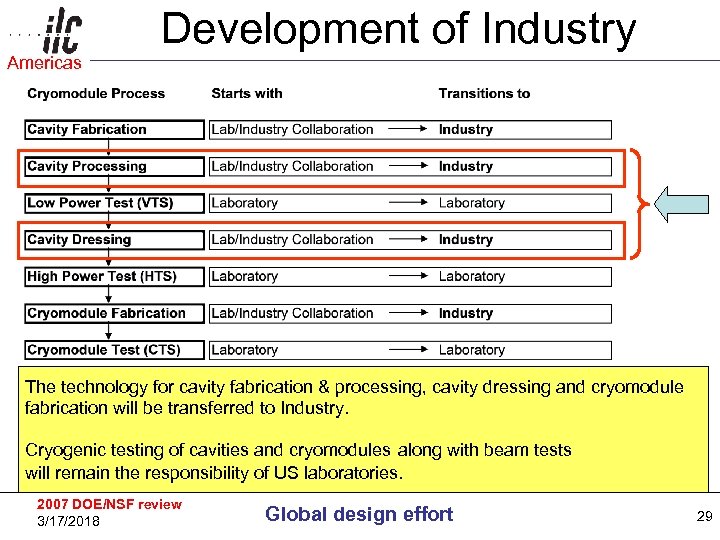Development of Industry Americas The technology for cavity fabrication & processing, cavity dressing and cryomodule fabrication will be transferred to Industry. Cryogenic testing of cavities and cryomodules along with beam tests will remain the responsibility of US laboratories. 2007 DOE/NSF review 3/17/2018 Global design effort 29