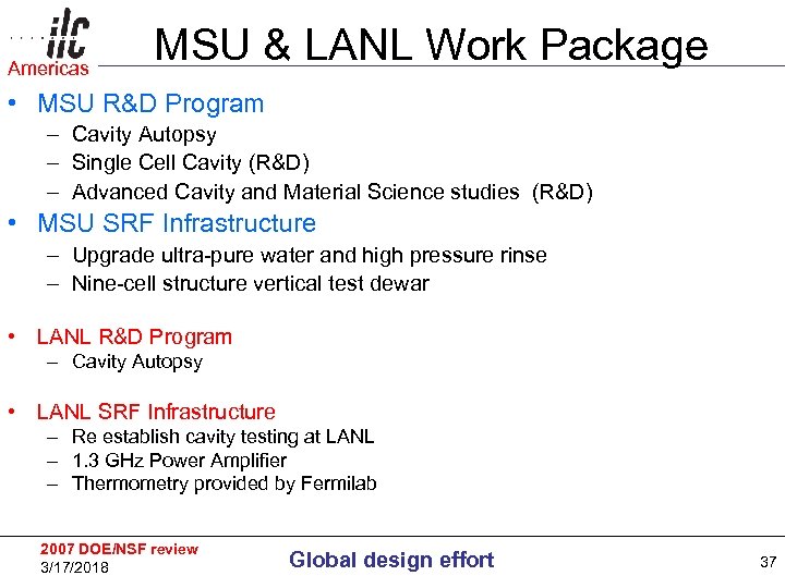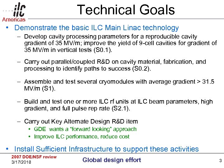 Technical Goals Americas • Demonstrate the basic ILC Main Linac technology – Develop cavity processing parameters for a reproducible cavity gradient of 35 MV/m; improve the yield of 9 -cell cavities for gradient of 35 MV/m in vertical tests (S 0. 1). – Carry out parallel/coupled R&D on cavity material, fabrication, and processing to identify paths to success (S 0. 2). – Assemble and test several cryomodules with average gradient > 31. 5 MV/m (S 1). – Build and test one or more ILC rf units at ILC beam parameters, high gradient, and full pulse rep rate (S 2. 1). – Carry out Key Alternate Design R&D item • GDE wants a “forward looking” approach • Improve ILC performance, reduce cost • Install Sufficient Infrastructure to support these activities 2007 DOE/NSF review 3/17/2018 Global design effort 3
