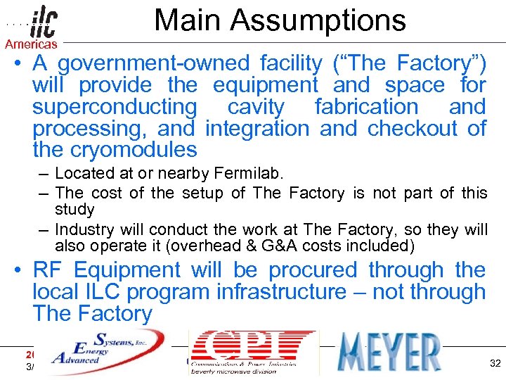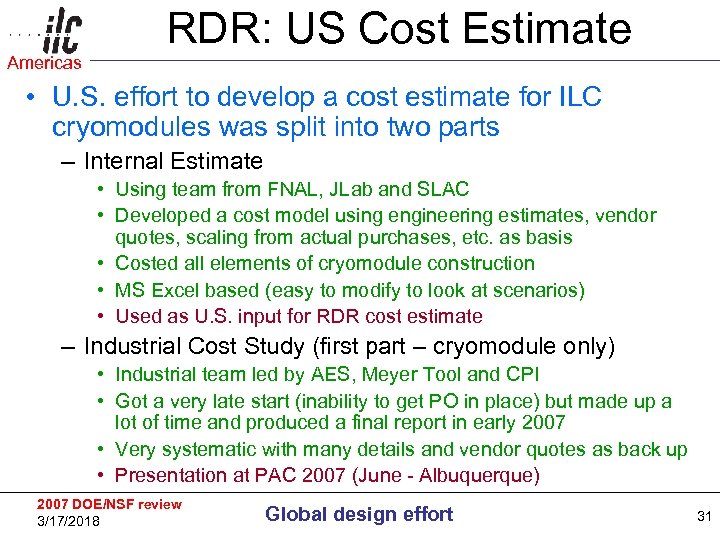 RDR: US Cost Estimate Americas • U. S. effort to develop a cost estimate for ILC cryomodules was split into two parts – Internal Estimate • Using team from FNAL, JLab and SLAC • Developed a cost model using engineering estimates, vendor quotes, scaling from actual purchases, etc. as basis • Costed all elements of cryomodule construction • MS Excel based (easy to modify to look at scenarios) • Used as U. S. input for RDR cost estimate – Industrial Cost Study (first part – cryomodule only) • Industrial team led by AES, Meyer Tool and CPI • Got a very late start (inability to get PO in place) but made up a lot of time and produced a final report in early 2007 • Very systematic with many details and vendor quotes as back up • Presentation at PAC 2007 (June - Albuquerque) 2007 DOE/NSF review 3/17/2018 Global design effort 31