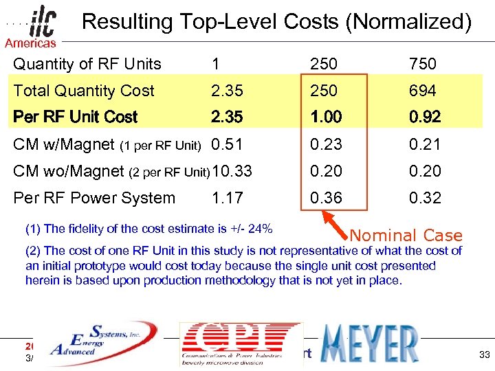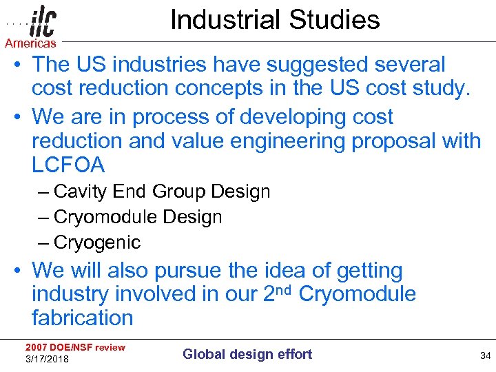Resulting Top-Level Costs (Normalized) Americas Quantity of RF Units 1 250 750 Total Quantity Cost 2. 35 250 694 Per RF Unit Cost 2. 35 1. 00 0. 92 CM w/Magnet (1 per RF Unit) 0. 51 0. 23 0. 21 CM wo/Magnet (2 per RF Unit) 10. 33 0. 20 Per RF Power System 0. 36 0. 32 1. 17 (1) The fidelity of the cost estimate is +/- 24% Nominal Case (2) The cost of one RF Unit in this study is not representative of what the cost of an initial prototype would cost today because the single unit cost presented herein is based upon production methodology that is not yet in place. 2007 DOE/NSF review 3/17/2018 Global design effort 33