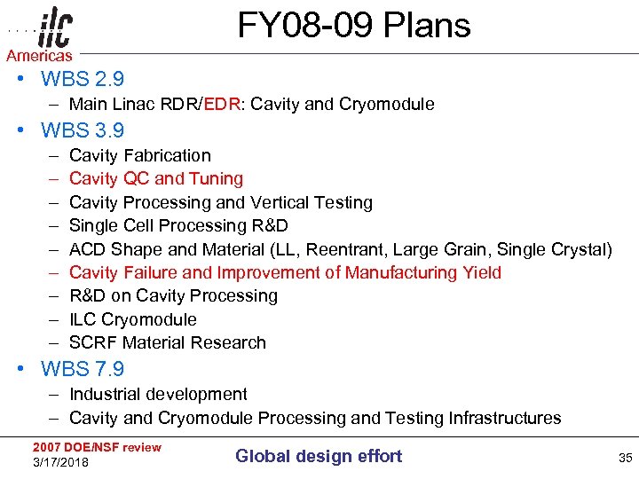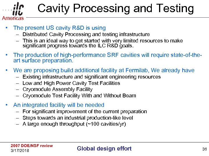 FY 08 -09 Plans Americas • WBS 2. 9 – Main Linac RDR/EDR: Cavity and Cryomodule • WBS 3. 9 – – – – – Cavity Fabrication Cavity QC and Tuning Cavity Processing and Vertical Testing Single Cell Processing R&D ACD Shape and Material (LL, Reentrant, Large Grain, Single Crystal) Cavity Failure and Improvement of Manufacturing Yield R&D on Cavity Processing ILC Cryomodule SCRF Material Research • WBS 7. 9 – Industrial development – Cavity and Cryomodule Processing and Testing Infrastructures 2007 DOE/NSF review 3/17/2018 Global design effort 35