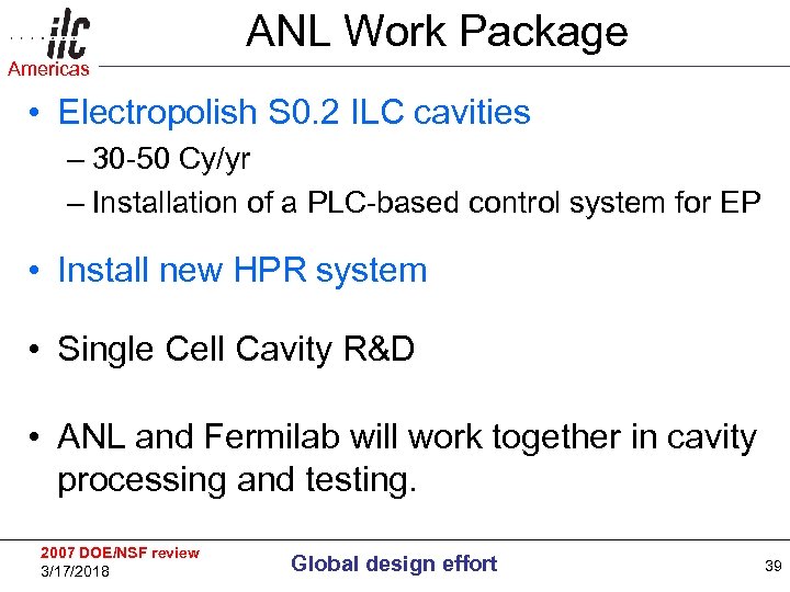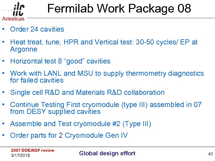 ANL Work Package Americas • Electropolish S 0. 2 ILC cavities – 30 -50 Cy/yr – Installation of a PLC-based control system for EP • Install new HPR system • Single Cell Cavity R&D • ANL and Fermilab will work together in cavity processing and testing. 2007 DOE/NSF review 3/17/2018 Global design effort 39