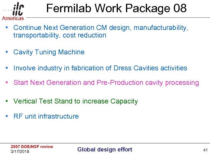 Fermilab Work Package 08 Americas • Order 24 cavities • Heat treat, tune, HPR and Vertical test: 30 -50 cycles/ EP at Argonne • Horizontal test 8 “good” cavities • Work with LANL and MSU to supply thermometry diagnostics for failed cavities • Single cell R&D and Materials R&D collaboration • Continue Testing First cryomodule (type III) assembled in 07 from DESY supplied cavities • Assemble and Test cryomodule #2 (Type III) • Order parts for 2 Cryomodule Gen IV 2007 DOE/NSF review 3/17/2018 Global design effort 40