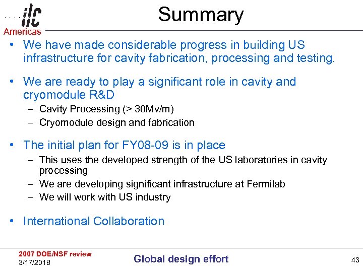 International Collaboration Americas • American Regional Team is collaborating on ILC Cavity and Cryomodule R&D. – We are participating in the S 0, S 1 and S 2 R&D programs – US purchased/produced cavities will go to KEK and DESY for “Tight Loop” S 0 processing – KEK and DESY cavities will come to US for processing. • We are coordinating the ILC Cryomodule Design effort • We collaborate with INFN in development and testing of Tuner • We are developing new collaboration – India (RRCAT, BARC, IUAC, UD) joined TTC • Detailed MOU is in preparation that could lead to an RF unit fabrication • India is fabricating Cavity fabrication tooling • Two scientists from India will spend time at Fermilab and coordinate work at Indian laboratories. – TRIUMF • Cavity fabrication • Tuner 2007 DOE/NSF review 3/17/2018 Global design effort 42