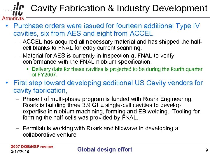 Cavity Fabrication: 1. 3 GHz Americas • In a collaborative effort with FNAL, Jlab has developed the tooling and infrastructure to fabricate 1. 3 GHz cavities. – Jlab has completed a prototype cavity (Type III+) to fine tune the tooling, – Jlab has fabricated two Type IV (symmetric beam tubes) cavities using large grain niobium. – Both large grain cavities are scheduled for mechanical measurements, BCP processing and vertical testing in the near future. – Jlab is also completing two Type III+ cavities using fine grain niobium. 2007 DOE/NSF review 3/17/2018 Global design effort 8