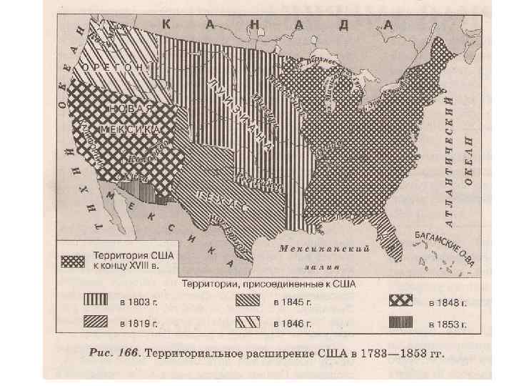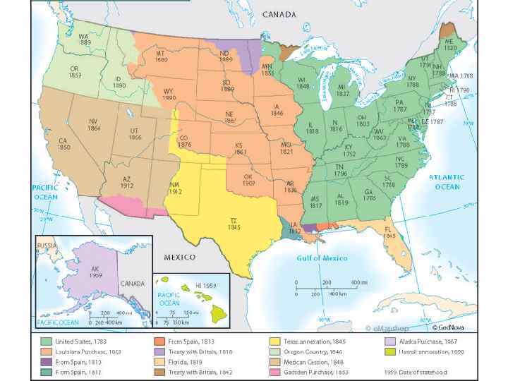 Приращение территории США • Луизиана – куплена у Франции в 1803 за 15 млн. долл. • Флорида – приобретена у Испании в 1819 г. • Долина Миссисипи: 1816 -1821 гг. - штаты Индиана, Миссисипи, Иллинойс, Алабама, Мэн, Миссури • Техас – 1845 г. аннексирован США • Орегон -1846 г. Орегонский договор – граница между США и Канадой по 49 параллели • Калифорния (+ территория между Калифорнией и Техасом – Новая Мексика) – 1848 г. Калифорния – статус штата 1850 г. • Аляска (и Алеутские о-ва) – куплена у России в 1867 г. , статус штата в 1958 г. • Гавайские о-ва – аннексированы в 1898 г. , объявлены территорией США в 1904 г. , статус 50 -ого штата – 1959 г.