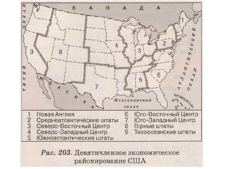Америка: Северная и Южная • Северная -- США -- Канада -- Гренландия -- Бермудские о-ва, о-ва Сен-Пьер и Микелон • Латинская -- южная часть материка Северная Америка (к югу от р. Рио-Гранде) -- Вест-Индия (Большие и Малые Антильские о-ва, Багамские о-ва) -- материк Южная Америка
