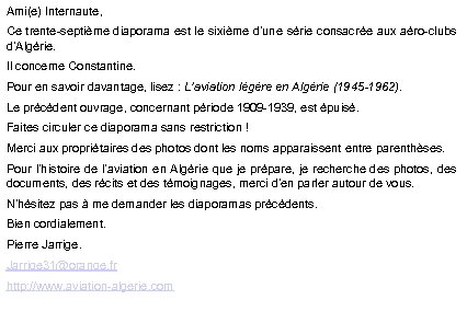 Ami(e) Internaute, Ce trente-septième diaporama est le sixième d’une série consacrée aux aéro-clubs d’Algérie. Il concerne Constantine. Pour en savoir davantage, lisez : L’aviation légère en Algérie (1945 -1962). Le précédent ouvrage, concernant période 1909 -1939, est épuisé. Faites circuler ce diaporama sans restriction ! Merci aux propriétaires des photos dont les noms apparaissent entre parenthèses. Pour l’histoire de l’aviation en Algérie que je prépare, je recherche des photos, des documents, des récits et des témoignages, merci d’en parler autour de vous. N’hésitez pas à me demander les diaporamas précédents. Bien cordialement. Pierre Jarrige 31@orange. fr http: //www. aviation-algerie. com