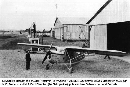 Devant les installations d’Oued-Hamimin, le Phalène F-AMSL « La Femme Seule » acheté en 1936 par le Dr Francis Lavillat à Paul Planchat (de Philippeville), puis vendu à l’Aéro-club (Henri Bernet)