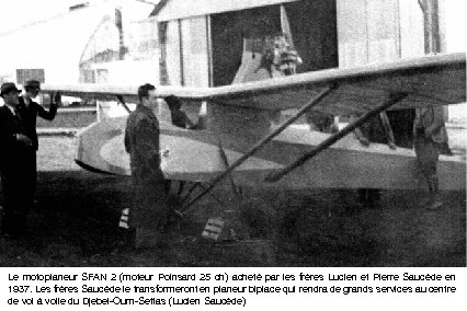 Le motoplaneur SFAN 2 (moteur Poinsard 25 ch) acheté par les frères Lucien et Pierre Saucède en 1937. Les frères Saucède le transformeront en planeur biplace qui rendra de grands services au centre de vol à voile du Djebel-Oum-Settas (Lucien Saucède)