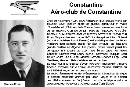 Constantine Aéro-club de Constantine Maurice Bovet Créé en novembre 1927, sous l’impulsion d’un groupe mené par Maurice Bovet (ancien pilote de guerre, agriculteur et maire d’Oued-Zenati), l’Aéro-club de Constantine commence son activité par un meeting organisé en juin 1930 sur l’hippodrome de Sidi. Mabrouk, suivi d’autres dont les recettes permettent l’achat d’un Potez 36 qui arrive en octobre 1932. Le chef-pilote Julien Richard (auquel succèdera André Fenech) est assisté par des moniteurs militaires dont Edmond Ballin (de Saint-Arnaud) qui fera une grande carrière en Algérie. Les pilotes formés seront parmi les principaux animateurs du club : les frères Lucien et Pierre Saucède, Gustave Wolf, Louis Fournel, Raymond Pourquié, Jean Meyer, André Gueit, Jean-Baptiste Cometti, Charles Filippi, Jean Serrières, Marceau Palats et de nombreux autres. Le club, qui a la chance d’avoir l’excellent mécanicien Antoine Sposito, s’installe sur le nouvel aérodrome d’Oued-Hamimin en avril 1934 et reçoit de nombreux visiteurs. La section féminine d’Henriette Guerreau est très active, ainsi que la section modéliste animée par Jean Meyer et la section prémilitaire animée par l’Adj Veran. Le club participe aussi à la création du centre de vol à voile du Djebel-Oum-Settas.