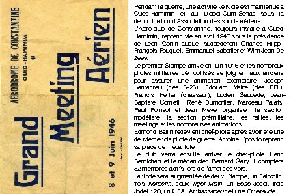 Pendant la guerre, une activité vélivole est maintenue à Oued-Hamimin et au Djebel-Oum-Settas sous la dénomination d’Association des sports aériens. L’Aéro-club de Constantine, toujours installé à Oued. Hamimin, reprend vie en avril 1946 sous la présidence de Léon Gohin auquel succèderont Charles Filippi, François Fouquet, Emmanuel Sabatier et Wim Jean De Zeew. Le premier Stampe arrive en juin 1946 et les nombreux pilotes militaires démobilisés se joignent aux anciens pour assurer une animation exemplaire. Joseph Santacreu (des B-26), Edouard Maire (des FFL), Francis Herter (chasseur), Lucien Saucède, Jean. Baptiste Cometti, René Dumortier, Marceau Palats, Paul Poinsot et Jean Meyer organisent la section modéliste, la section prémilitaire, les rallies, les meetings et les nombreuses animations. Edmond Ballin redevient chef-pilote après avoir été une deuxième fois pilote de guerre. Antoine Sposito reprend sa place de mécanicien. Le club verra ensuite arriver le chef-pilote Henri Bernichan et le mécanicien Bernard Gary. Il comptera 52 membres actifs lors de l’arrêt des vols. La flotte sera augmentée de deux Stampe, un Fairchild, trois Norécrin, deux Tiger Moth, un Bébé Jodel, trois Jodel 120, un CEA Ambassadeur et une Emeraude.