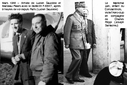 Mars 1948 – Arrivée de Lucien Saucède et Marceau Palats avec le Norécrin F-BBKT, après 9 heures de vol depuis Paris (Lucien Saucède) Le Maréchal Juin, enfant du Constantinois, visite l’Aéro-club en compagnie de Charles Filippi (Joseph Santacreu)