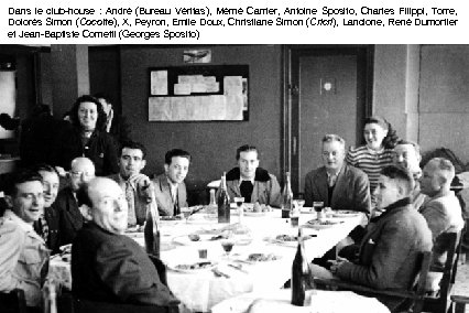 Dans le club-house : André (Bureau Véritas), Mémé Carrier, Antoine Sposito, Charles Filippi, Torre, Dolorès Simon (Cocotte), X, Peyron, Emile Doux, Christiane Simon (Cricri), Lancione, René Dumortier et Jean-Baptiste Cometti (Georges Sposito)