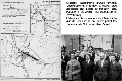 Ci-contre, l’aérodrome d’Oued-Hamimin. L’aérodrome d’Aïn-El-Bey, à l’ouest, plus accessible aux avions de transport, sera inauguré le 25 janvier 1960 (cadeau de la 25ème heure). Ci-dessous, les membres de l’Automobileclub de Constantine qui seront parmi les fondateurs de l’Aéro-club (Jean Bovet)