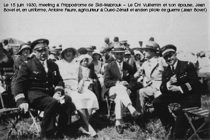 Le 15 juin 1930, meeting à l’hippodrome de Sidi-Mabrouk – Le Cnl Vuillemin et son épouse, Jean Bovet et, en uniforme, Antoine Faure, agriculteur à Oued-Zénati et ancien pilote de guerre (Jean Bovet)