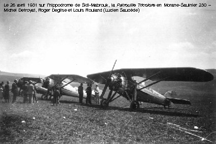 Le 26 avril 1931 sur l’hippodrome de Sidi-Mabrouk, la Patrouille Tricolore en Morane-Saulnier 230 – Michel Detroyat, Roger Deglise et Louis Rouland (Lucien Saucède)