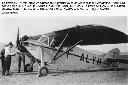 Le Potez 36 F-ALYM, arrivé en octobre 1932, premier avion de l’Aéro-club de Constantine. Il sera suivi par le Potez 36 F-ALXX, le Luciole F-AMDR, le Potez 43 F-AMJV, le Potez 58 F-AMZJ, le Caudron Phalène F-AMSL, les Caudron Pélican F-ANTQ et F-ANTV et le Caudron Aiglon F-AOKA (Jean Meyer)