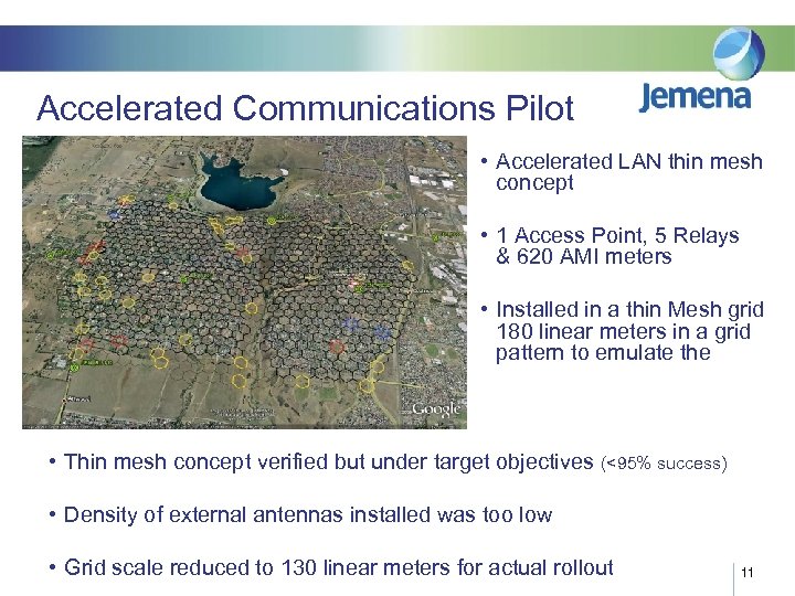 An Alternative Rollout Approach • In January 2011, UED & JEN accelerated their AMI communications rollout – to cover 95% of the meter population by June 2011 – to allow meter installed within that area has a better than 95% chance of communicating – so new connections, solar installs, etc. can be installed as AMI meters – and business as usual can transition from legacy processes earlier – Halt purchasing traditional Meters (thousands per month) 10
