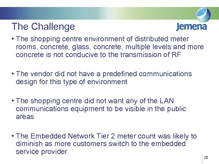 The Challenge • The shopping centre environment of distributed meter rooms, concrete, glass, concrete, multiple levels and more concrete is not conducive to the transmission of RF • The vendor did not have a predefined communications design for this type of environment • The shopping centre did not want any of the LAN communications equipment to be visible in the public areas • The Embedded Network Tier 2 meter count was likely to diminish as more customers switch to the embedded service provider 20