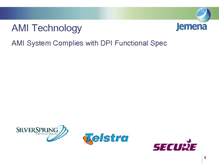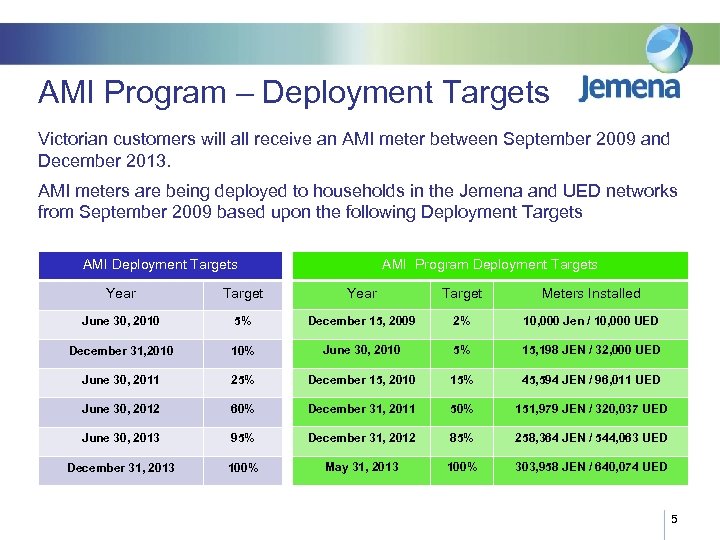 AMI Program – Deployment Targets Victorian customers will all receive an AMI meter between September 2009 and December 2013. AMI meters are being deployed to households in the Jemena and UED networks from September 2009 based upon the following Deployment Targets AMI Program Deployment Targets AMI Deployment Targets Year Target Meters Installed June 30, 2010 5% December 15, 2009 2% 10, 000 Jen / 10, 000 UED December 31, 2010 10% June 30, 2010 5% 15, 198 JEN / 32, 000 UED June 30, 2011 25% December 15, 2010 15% 45, 594 JEN / 96, 011 UED June 30, 2012 60% December 31, 2011 50% 151, 979 JEN / 320, 037 UED June 30, 2013 95% December 31, 2012 85% 258, 364 JEN / 544, 063 UED December 31, 2013 100% May 31, 2013 100% 303, 958 JEN / 640, 074 UED 5