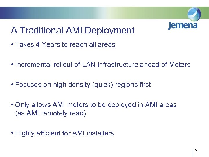 Initial Rollout Approach • Begin in high density areas first, then move to rural communications ahead of meters 8