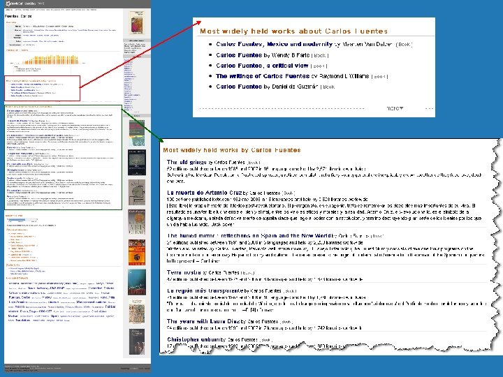 Muestra de actividades “Biblioteca 2. 0” de OCLC World. Cat. org • Contenido total de World. Cat en la Web • Se puede buscar todo • Despliega ubicaciones de bibliotecas por todo el mundo que tiene una copia del título • Características sociales: • Perfiles de usuarios • Listas • Barras de herramientas y “widgets” • Buscador: Fire. Fox • Facebook widgets World. Cat distribuido en la Web • Google, Yahoo, etc. • Enlaces a World. Cat. org en Google Book Search, otros sitios World. Cat Identities • Páginas para cada uno de los 25 millones de personas, organizaciones, y personajes ficticios en World. Cat • Enlaces a World. Cat. org, Wikipedia, otros sitios APIs (Interfaces de Programación Aplicada) • x. ISBN, x. ISSN, etc. • World. Cat API