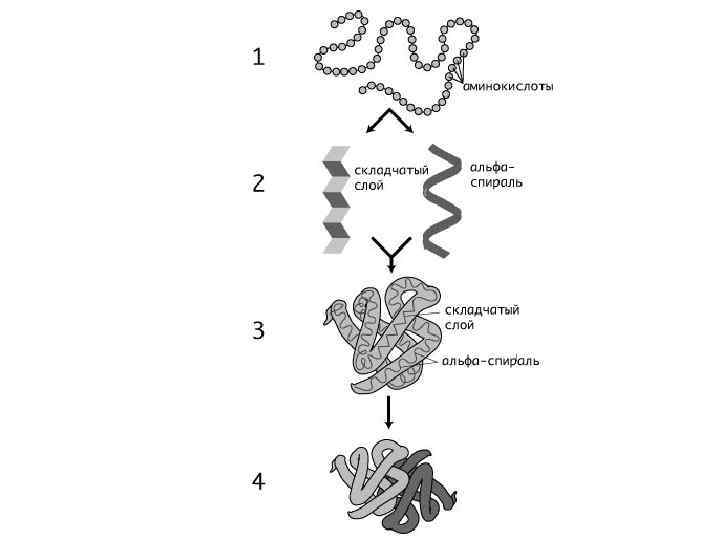Структура (пространственное строение) белка: • Первичная – полипептидная цепь (Ак связаны пептидной связью) • Вторичная (…+ водородные связи между группами –NH…ОС- пептидных цепей) - спираль - складчатый лист (много Гли, Про, Асп- антиспиральные Ак) • Третичная – глобулы или фибриллы(…+ слабые взаимодействия: 1)гидрофобные, 2) электростатические(ионные), 3) диполь-дипольные; прочная ковалентная (дисульфидная) связь) • Четвертичная (Hb)– несколько глобул, соединенных между собой слабыми связями (см. 15 связи третичной структуры, кроме ковалентной).