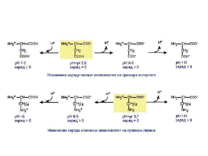 Изменение заряда аминокислот при смещении р. Н раствора в кислую или щелочную сторону.