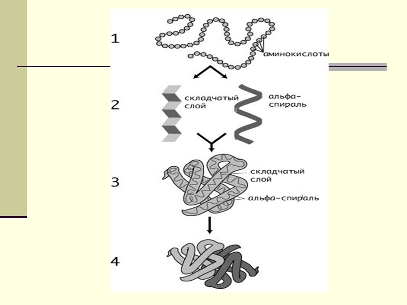 Строение белка Различают первичную, вторичную и третичную структуры белка. Некоторые белки имеют и четвертичную структуру. Под первичной структурой белка понимается конкретная последовательность аминокислотных остатков в полипептидной цепи. Вторичная структура - это конформация полипептидной цепи, т.е. способ скручивания цепи в пространстве за счет водородных связей между группами NH и CO. Существуют три основных способа укладки полипептидной цепи в пространстве – α-спираль, β-структура и β-изгиб.