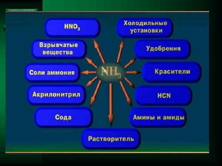 HNO 3 өндірісі Аммиак (NH 4)2 CO 3 NH 4 NO 3 мочевина (NH 4)2 SO 4 Сұйық тыңайтқыш Хладагент ретінде аммофоса