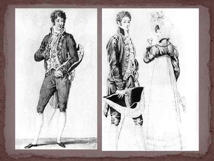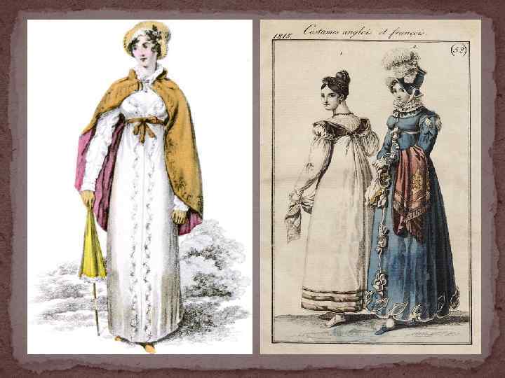 Глубоким было влияние стиля ампир в женской одежде. Пропорции костюма остаются такими же, как в конце XVIII в. (высокая талия делит фигуру в соотношении 1 : 7 и 1 : 6, прямая длинная юбка и узкий лиф). В 1809 г. в костюме вновь появляется корсет. Применение дорогих плотных тканей резко меняет пластику костюма. В нем появляется все больше декоративных элементов: рюшей, кружев, вышивки, оборок. Платье делают из плотного шелка или тонких прозрачных тканей, но на плотной шелковой подкладке, и вышивают однотонной белой гладью с золотой и серебряной нитью, блестящими пайетками. Оно часто имеет шлейф, низкое декольте, короткий рукав-фонарик на широком манжете.