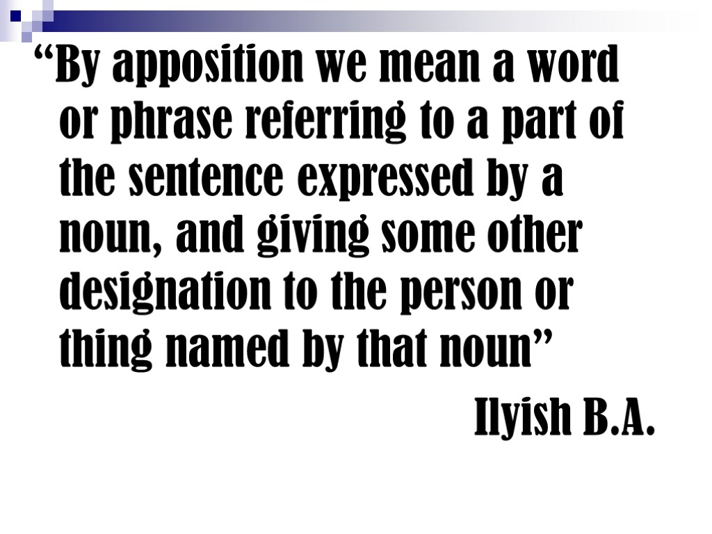 “By apposition we mean a word or phrase referring to a part of the sentence expressed by a noun, and giving some other designation to the person or thing named by that noun” Ilyish B.A.