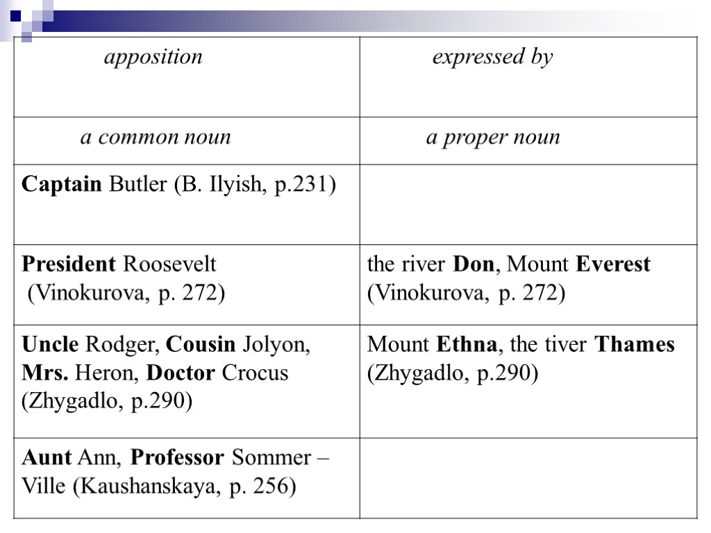Classifiction of the appositive phrases Pattern І: the river Thames A geographical object: If these men had their way they close the river Thames altogether. (Jerome, p.82) A living being: The dog Balthasar sniffed the edges of his trousers. (The Man…p.123) Things, abstract notions the lexical meaning of which is revealed: As for George’s nickname – «The Buccaneer» - he did not think much of that. (The Man…p.86)