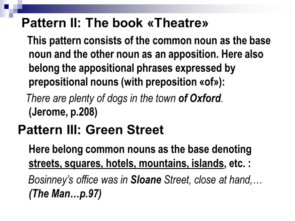 Pattern ІІ: The book «Theatre» This pattern consists of the common noun as the base noun and the other noun as an apposition. Here also belong the appositional phrases expressed by prepositional nouns (with preposition «of»): There are plenty of dogs in the town of Oxford. (Jerome, p.208) Pattern ΙΙΙ: Green Street Here belong common nouns as the base denoting streets, squares, hotels, mountains, islands, etc. : Bosinney’s office was in Sloane Street, close at hand,… (The Man…p.97)