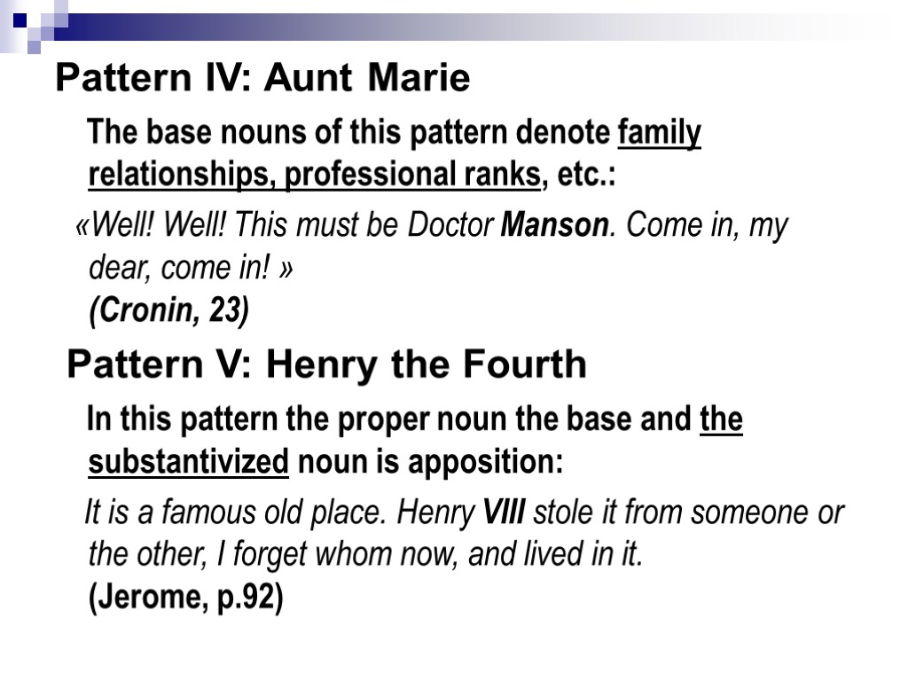Pattern ΙV: Aunt Marie The base nouns of this pattern denote family relationships, professional ranks, etc.: «Well! Well! This must be Doctor Manson. Come in, my dear, come in! » (Cronin, 23) Pattern V: Henry the Fourth In this pattern the proper noun the base and the substantivized noun is apposition: It is a famous old place. Henry VIII stole it from someone or the other, I forget whom now, and lived in it. (Jerome, p.92)