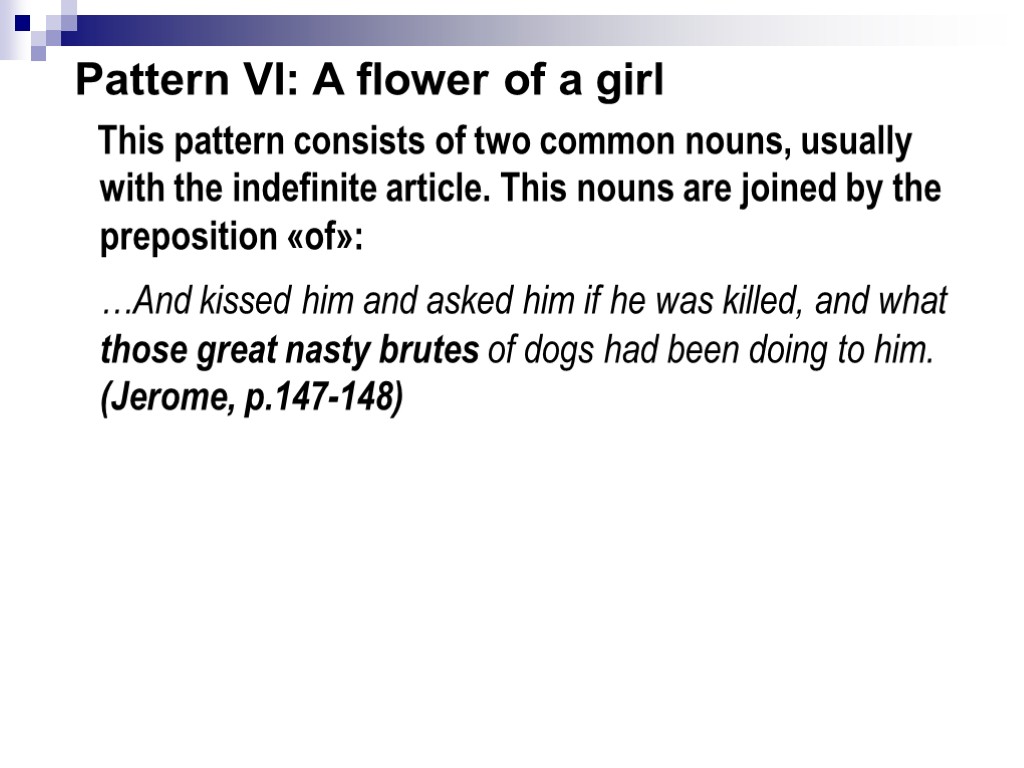 Pattern VI: A flower of a girl This pattern consists of two common nouns, usually with the indefinite article. This nouns are joined by the preposition «of»: …And kissed him and asked him if he was killed, and what those great nasty brutes of dogs had been doing to him. (Jerome, p.147-148)