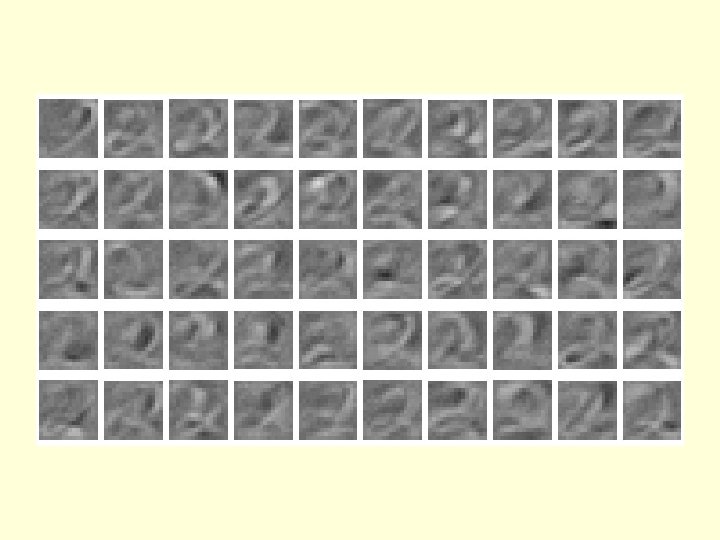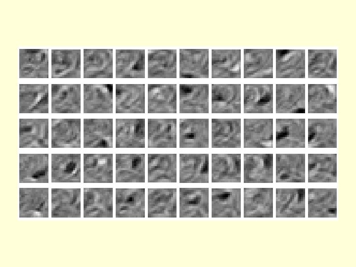The weights of the 50 feature detectors We start with small random weights to break symmetry