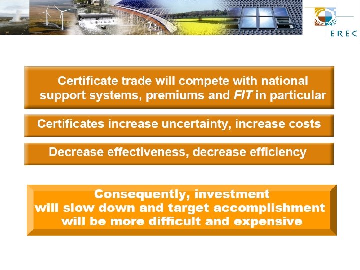 EREC – European Renewable Energy Council Umbrella organisation representing all RES sectors: AEBIOM EGEC EPIA ESHA European Biomass Association European Geothermal Energy Council European Photovoltaic Industry Association European Small Hydropower Association ESTIF EUBIA EWEA EUREC Agency European Solar Thermal Industry Federation European Biomass Industry Association European Wind Energy Association European Renewable Energy Research Centres Agency EU-OEA EBIO EREF European Ocean Energy Association European Bioethanol Industry Association European Renewable Energy Federation Associate members: Representation of European RES industry, trade & research