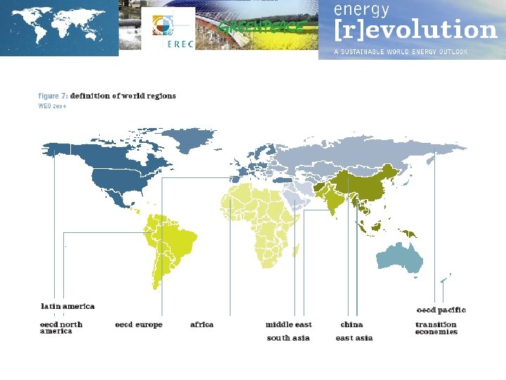 Approach ● development of a 10 -region model (based on IEA regions) ● implementation of energy balances in MESAP/Pla. Net, model calibration with IEA 2003 statistics ● economic development and population development according to IEA World Energy Outlook 2004 (extrapolated to 2050) ● Reference Scenario: based on IEA World Energy Outlook 2004 (extrapolated to 2050) ● Alternative Scenarios: demand scenarios: Ecofys supply scenarios: DLR ● Review process: regional counterparts (academia, NGO) EREC / Greenpeace