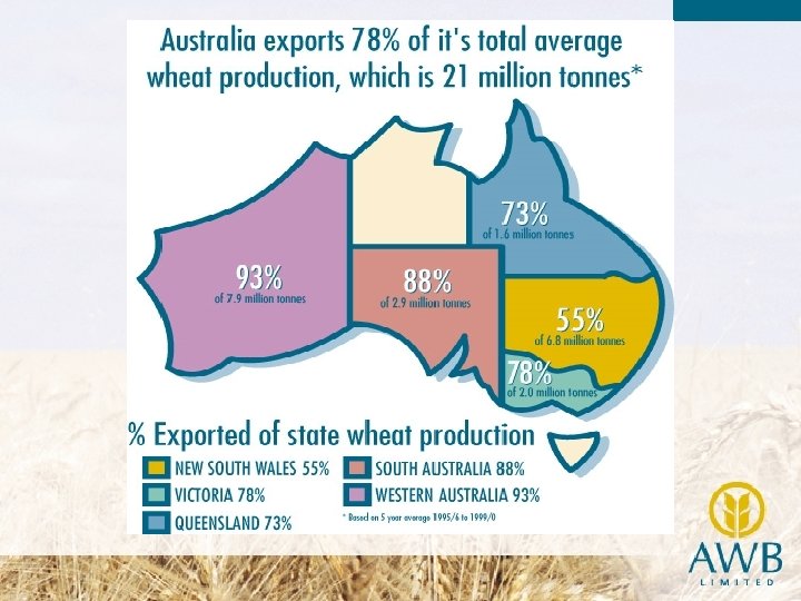 AWB is …. One of the largest wheat exporters in the world Exporter Wheat Export Volume (1) (m Tonnes) Canadian Wheat Board 19. 4 AWB 17. 1 Cargill (2) 13. 7 ADM (2) 4. 5 Conagra (2) 1. 9 1/ 99 -00, expected export volume 2/ U. S. exports only Source: USDA