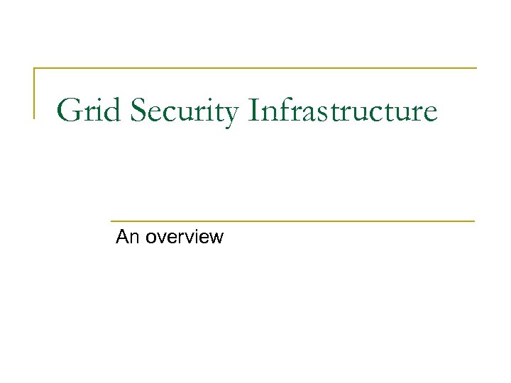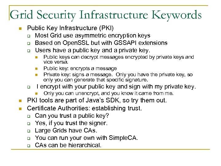 Grid Security Infrastructure Keywords n Public Key Infrastructure (PKI) q Most Grid use asymmetric encryption keys q Based on Open. SSL but with GSSAPI extensions q Users have a public key and a private key. n n n q I encrypt with your public key and sign with my private key. n n n Public keys can decrypt messages encrypted by private keys and vice versa. Public key: encrypts a message Private key: signs a message. Only you have the private key, so only you can generate that specific signature. Only you can unencrypt, and you know it came from me. PKI tools are part of Java’s SDK, so try them out. Certificate Authorities: establishing trust. q Can you trust a public key? q Yes, if you trust the signer. q Large Grids have CAs. q You can run your own with Simple. CA. q CAs can be hierarchical.