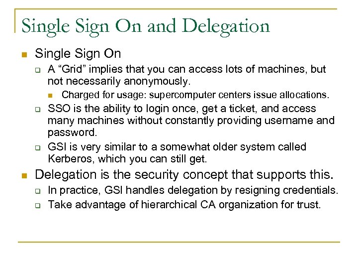 Single Sign On and Delegation n Single Sign On q A “Grid” implies that you can access lots of machines, but not necessarily anonymously. n q q n Charged for usage: supercomputer centers issue allocations. SSO is the ability to login once, get a ticket, and access many machines without constantly providing username and password. GSI is very similar to a somewhat older system called Kerberos, which you can still get. Delegation is the security concept that supports this. q q In practice, GSI handles delegation by resigning credentials. Take advantage of hierarchical CA organization for trust.