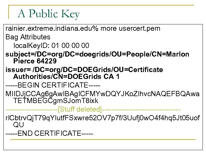 A Public Key rainier. extreme. indiana. edu% more usercert. pem Bag Attributes local. Key. ID: 01 00 00 00 subject=/DC=org/DC=doegrids/OU=People/CN=Marlon Pierce 64229 issuer= /DC=org/DC=DOEGrids/OU=Certificate Authorities/CN=DOEGrids CA 1 -----BEGIN CERTIFICATE----MIIDJj. CCAg 6 g. Aw. IBAg. ICFMYw. DQYJKo. ZIhvc. NAQEFBQAwa TETMBEGCgm. SJom. T 8 ixk -----------[Stuff deleted]----------------rl. Cbtrv. Qj. T 79 q. YIutf. FSxwre 52 OV 7 p 7 f/3 Uufj 0 w. O 4 f 4 hq 5 Jt 05 uof QU -----END CERTIFICATE-----