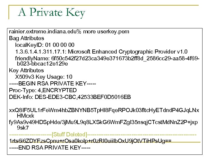 A Private Key rainier. extreme. indiana. edu% more userkey. pem Bag Attributes local. Key. ID: 01 00 00 00 1. 3. 6. 1. 4. 1. 311. 17. 1: Microsoft Enhanced Cryptographic Provider v 1. 0 friendly. Name: 6 f 50 c 542 f 27 d 23 ca 349 e 371673 b 2 ff 8 d_2586 cc 29 -aa 58 -4 f 69 b 023 -bbcac 12 e 129 e Key Attributes X 509 v 3 Key Usage: 10 -----BEGIN RSA PRIVATE KEY----Proc-Type: 4, ENCRYPTED DEK-Info: DES-EDE 3 -CBC, 42533 BEF 0 D 5016 EB xx. Q 8 IF 5 UL 1 r. Fe. Wm 4 hb. ZBNYNB 5 Tp. Hl 8 Fqe. RPOJk 03 fltc. Hy. ETdnd. P 4 GJq. LNx HMcxk fy 9 As 9 v 49 HDSp. Hde/3 j. Mu 9 L 9 q 8 LXSk. G 6 Wm. FZg. I 35 nsqj. CTcst. Md. Nn. Z 2 P+jxp 9 sk 7 ------------[Stuff Deleted]-----------------------------1 rts 6 i 6 ZDYFzs. Cpnu+r. Osa 0 kolp+r 0 z. RI 0 uii. Ib. Ox. U 9 j. Ot. VTi. HPs. Ug== -----END RSA PRIVATE KEY-----
