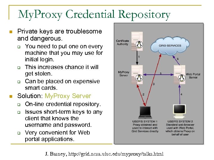 My. Proxy Credential Repository n Private keys are troublesome and dangerous. q q q n You need to put one on every machine that you may use for initial login. This increases chance it will get stolen. Can be placed on expensive smart cards. Solution: My. Proxy Server q q q On-line credential repository. Issues short-term keys to any client that knows the username and password. Very convenient for Web portal applications. J. Basney, http: //grid. ncsa. uiuc. edu/myproxy/talks. html