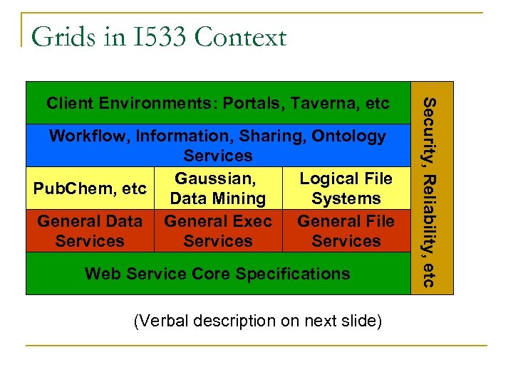 Grids in I 533 Context Workflow, Information, Sharing, Ontology Services Gaussian, Logical File Pub. Chem, etc Data Mining Systems General Data General Exec General File Services Web Service Core Specifications (Verbal description on next slide) Security, Reliability, etc Client Environments: Portals, Taverna, etc
