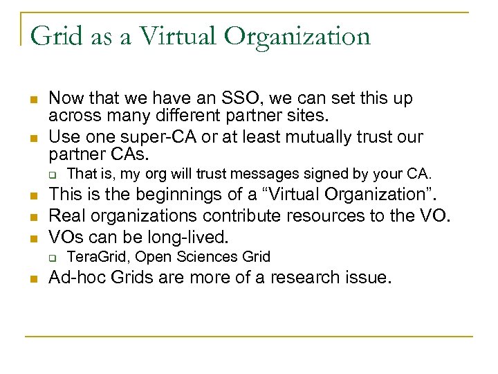 Grid as a Virtual Organization n n Now that we have an SSO, we can set this up across many different partner sites. Use one super-CA or at least mutually trust our partner CAs. q n n n This is the beginnings of a “Virtual Organization”. Real organizations contribute resources to the VO. VOs can be long-lived. q n That is, my org will trust messages signed by your CA. Tera. Grid, Open Sciences Grid Ad-hoc Grids are more of a research issue.